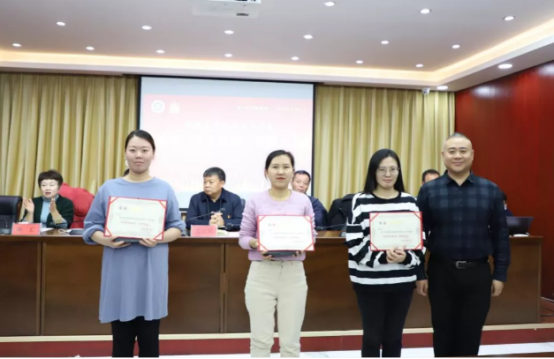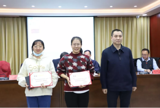 (学院党委委员、纪委书记赵玉为荣获taptap点点体育首届“金笔建院”优秀信息员铜笔奖的张悦,张文娜、徐文姣同志颁奖。)