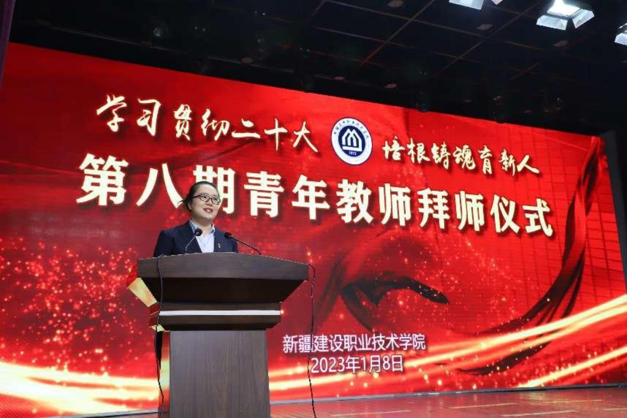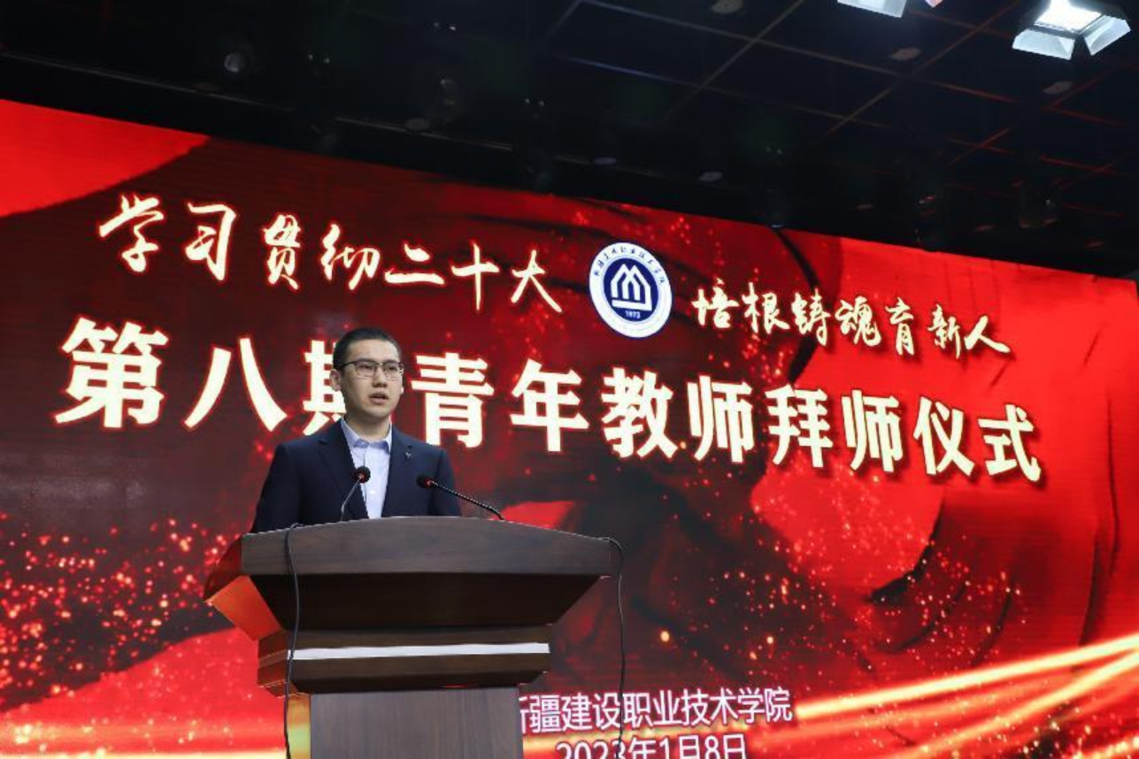 徒弟代表穆拜赛尔·阿不利孜老师代表新进教师发言。表达了对学院和师父的感激之情。他表示,所有新入职教师会本着虚心求教的态度,认真向师父学习请教,时刻牢记师父教诲, 主动钻研提升,不断创新,不辜负师父的期望和厚爱,不辜负学院的要求和培养,为建院发展贡献更大的力量。