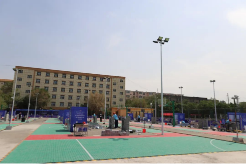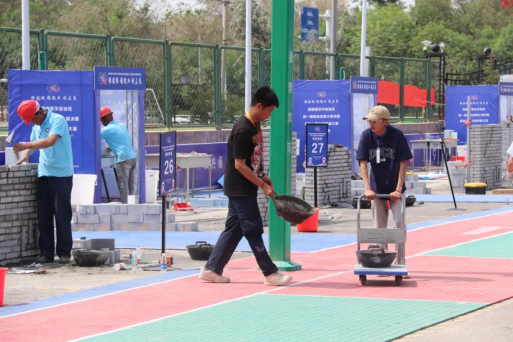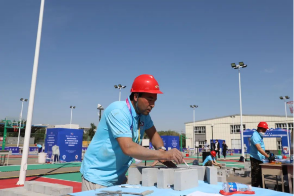 在新疆建设技师培训学院篮球场上,3400平方米的赛场上32个工位整齐排开,比赛用砖整齐码放,切割机、瓦刀、胶皮盆、图纸等砌筑用具一应俱全。“这次参赛选手覆盖范围很广,年龄跨度也很大,成人组的选手年龄最大的已经57岁了。”新疆建设技师培训学院砌筑赛场裁判助理彭茹说。