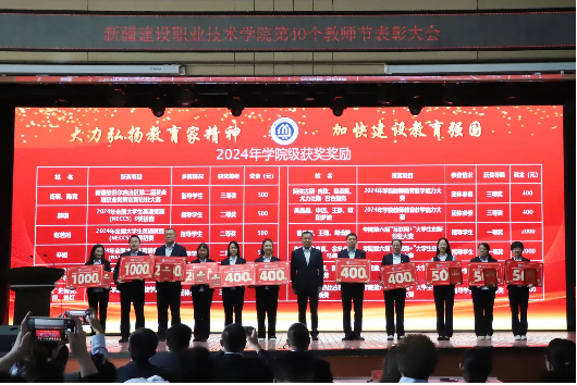 伴随着雄浑有力的国歌声响起,大会拉开帷幕。会上,学院党委副书记、院长党进宣读《关于表彰2023年度先进个人的决定》,党委副书记、副院长马桂珍宣读《关于表彰2023年度先进党支部和优秀共产党员的决定》,党委委员、副院长吴冶宣读《关于表彰2023年度党风廉政先进部门的决定》,党委副书记、副院长谢克热提·夏吾开提宣读《关于表彰2023-2024学年优秀班主任的决定》,副院长余冬贞宣读《关于表彰奖励2024年师生各类竞赛获奖的决定》,党委委员、副院长吴冶宣读《关于表彰光荣从事教育教学工作30年教职工的决定》。教师们依次走上主席台,学院领导为先进集体和个人颁奖。