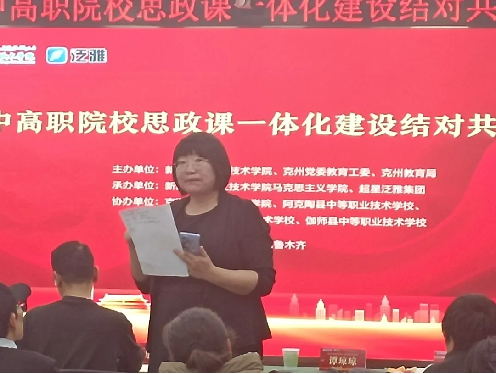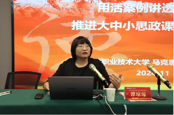 新疆农业职业技术大学马克思主义学院教授谭琼琼对四位教学备课展示的老师进行了点评指导,肯定了四位教师在不同学段采用不同的教学方式和教学案例,将中职高职的思想政治教育进行系统性、连贯性的构建,实现纵向汇通,体现出了系统观念,系统思维,同时也指出了在不同学段教学中选取案例、思政课的理论性、学情把握等方面存在的问题。