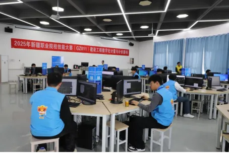 建设工程数字化计量与计价赛项的选手紧盯电脑屏幕,快速敲击键盘,在复杂的数据和图纸中精准计算,展现出过硬的专业素养。
