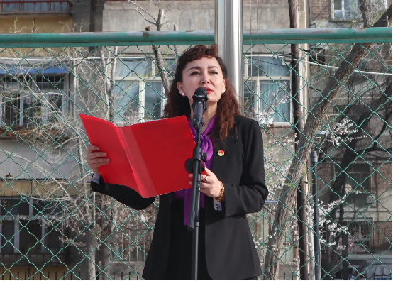 (党委委员、党委宣传部部长迪丽拜尔·克依木在建材校区致辞)