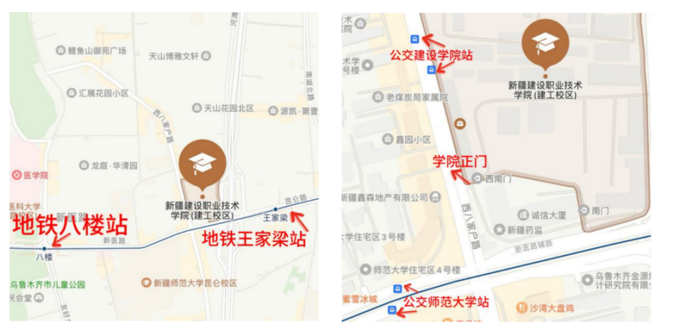 3.市内可乘坐61、63、304、32、916、503、56路等公交车在建设学院站下车;或乘坐BRT2号线、3号线至新疆师范大学站下车;或乘坐地铁1号线至王家梁或八楼站下车。