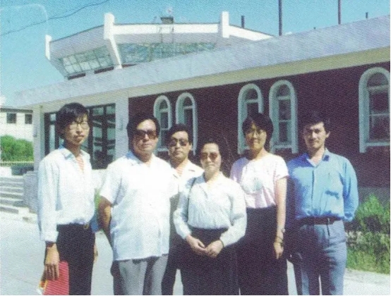(1990年,陆易农(左二)和丁百齐校长(右三)等老师在城建校区花房前合影)