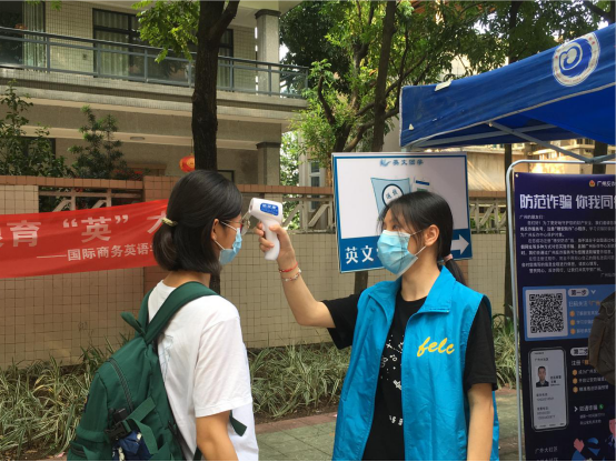 在学院接待岗,同学们再次接受测温并登记,出示行程卡和粤康码,以及事先审批通过的返校凭证,核验正常后确认返校。
