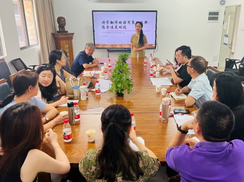 在交流会结束后,王东风教授做了一场题为《诗学翻译的语用学策略选择:隐含还是明说?》的学术讲座。本讲座主要围绕诗学翻译中的语用学策略。在王教授看来,诗学翻译应遵循诗学的原理,以尽可能地再现原文的文学性及蕴含其中的诗学功能为其主要目标。他在讲座中引用了结构主义诗学的领军人物雅各布森有关诗学的观点,即诗学是运用语言学来研究文学语言的学问,因此诗学是语言学的一个组成部分。他从语言学的角度,反观诗学对文学性和诗学功能的界定是否合理,诗学的理念是否适合于文学翻译,认为这是一个一直被忽略的问题。接着他从语用学的角度,以丰富的案例探讨了诗学翻译的合理性和可行性。